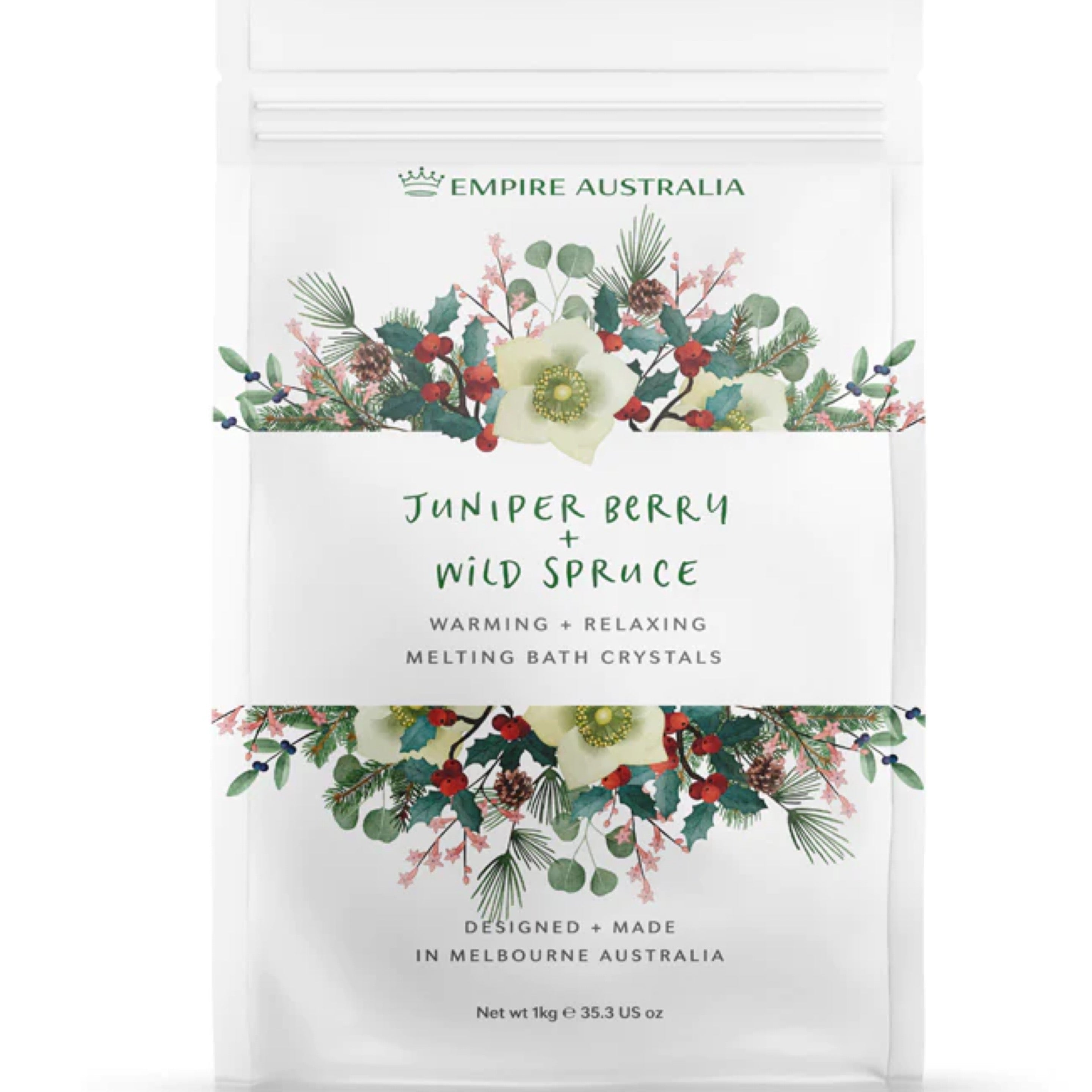 JUNIPER BERRY BATH SALTS - (EMPIRE) - BATH SALTS Infused with the soothing aroma of juniper berries, this blend of Epsom and sea salts is designed to nourish the skin and provide stress relief during your bath. Perfect for unwinding and promoting relaxation.