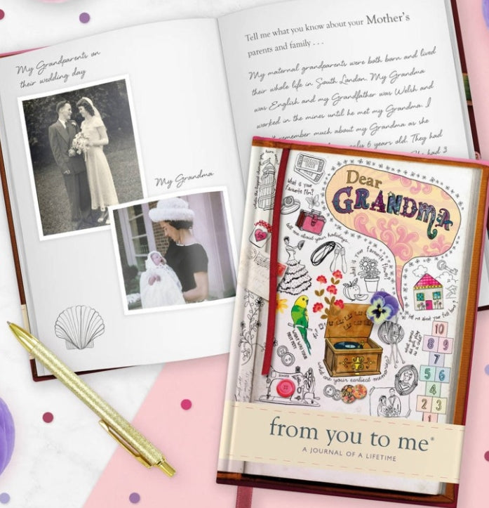 An award-winning, beautiful fabric and gold foil blocked memory journal, filled with over 60 fun and inspiring questions, carefully compiled to make it easy for your grandmother to tell her story and share her wonderful memories and aspirations with you. It's a priceless gift that's returned to you once completed!