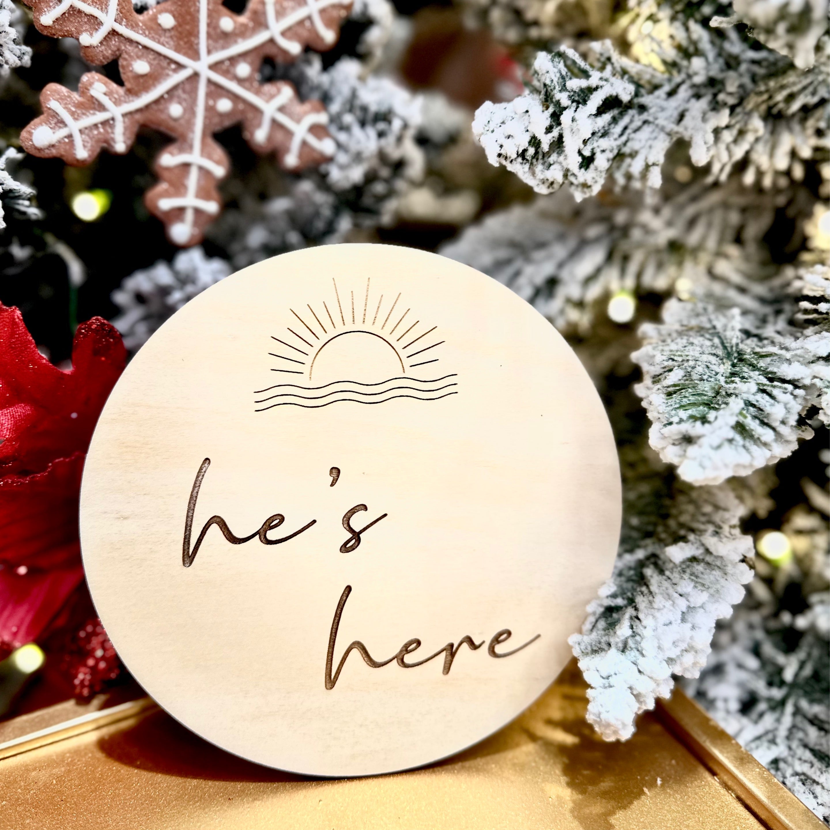 HE'S HERE WOOD SIGN CIRCLE